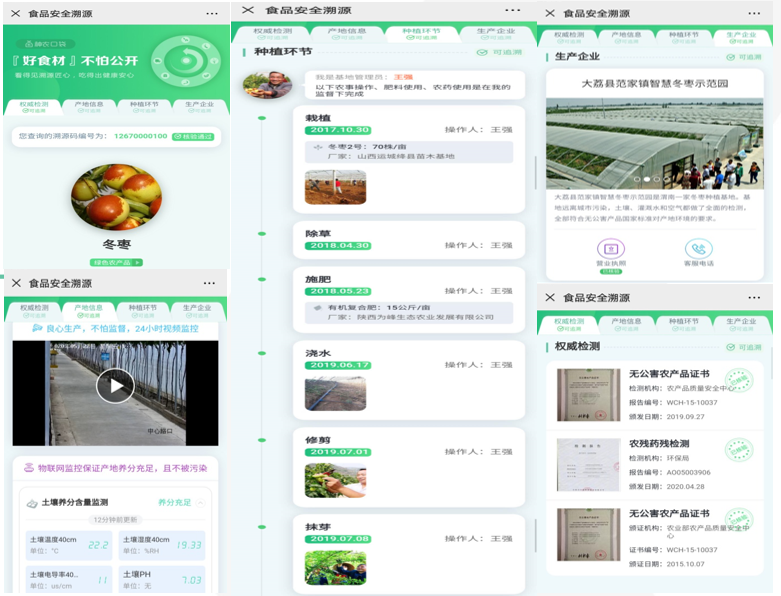 基于区块链技术的可追溯系统,宏算科技为华南区打造华南泛亚粮食供应链平台,通过光谱分级分拣设备对农产品的外观和理化信息进行快速检测,例如:大小、色泽、表皮破损、水分含量、糖分含量等。采用流水线方式进行产品分级分拣,通过产品分拣分级使农产品品质科学分类,最终产生销售溢价。生产环节的地块信息、农事操作、投入品、检测报告与认证证书,仓储环节的出入库信息,发货环节的物流信息,均自动汇总到农产品包装上的身份识别码中,消费者使用微信一扫,即能查看农产品从产地到销售地的全流程溯源,增加消费者从接触到购买的转化率。所有的溯源数据来源于农场每天的日常管理工作。农场管理得越好,可追溯的信息越丰富。每一个溯源码都有唯一的编号,作为农产品的身份证实现了一物一码。物联网监测 + 遥感影像 + 公信检测,多维度追溯,数据不可篡改,可信度高。对农产品从田间到餐桌的全流程进行追溯,让生产过程可视化、透明化、实时化,为农产品提供有力数据信用背书,打造认同体系和塑造企业品牌。
